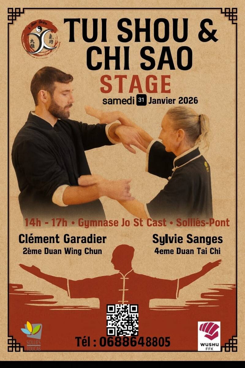 3 stages annoncés : Qi Gong, La canne (arme du Taichi), Tui shou et Chi Sao (voir affiches ci dessous ou dans la rubrique stage.)